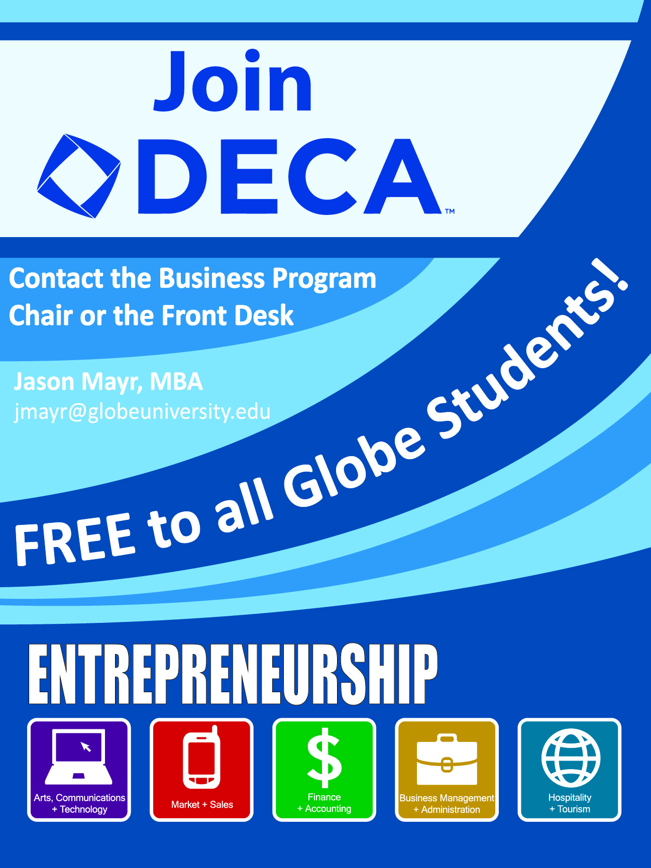 A flyer designed for the DECA entrepreneurship club at Globe University. All logos are custom vector art.