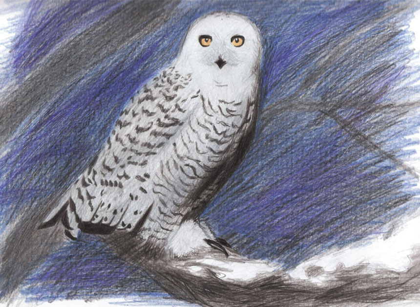 A hand-drawn snowy owl that demonstrates a cool color scheme.